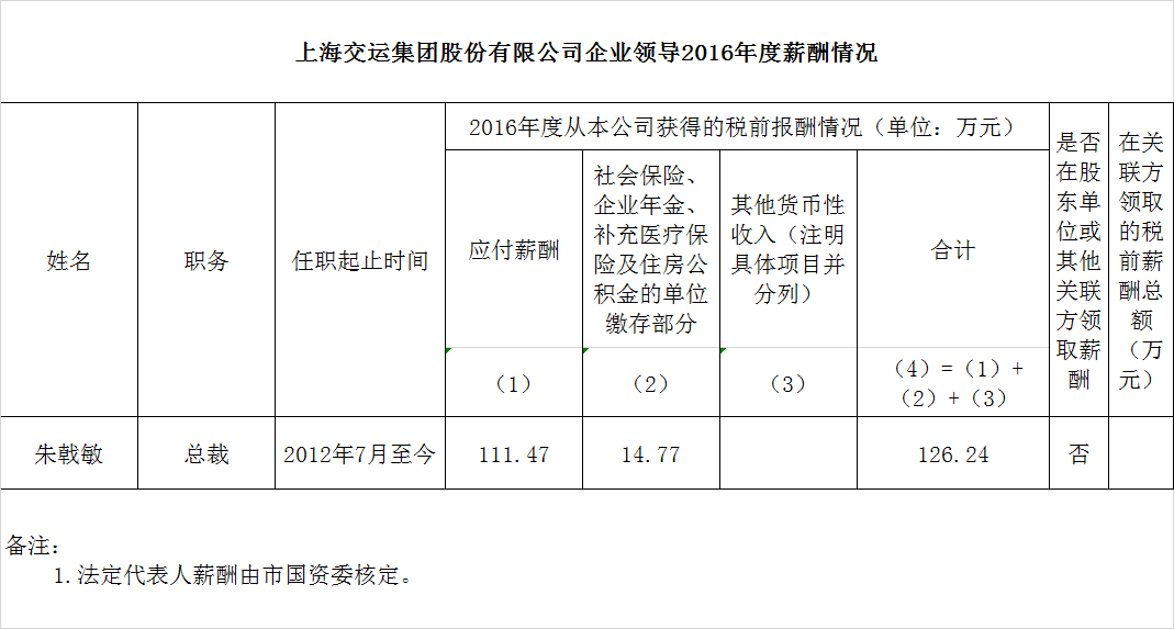 上海交运集团股份有限公司企业领导2016年度薪酬情况