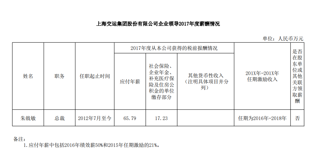 上海交运集团股份有限公司企业领导2017年度薪酬情况